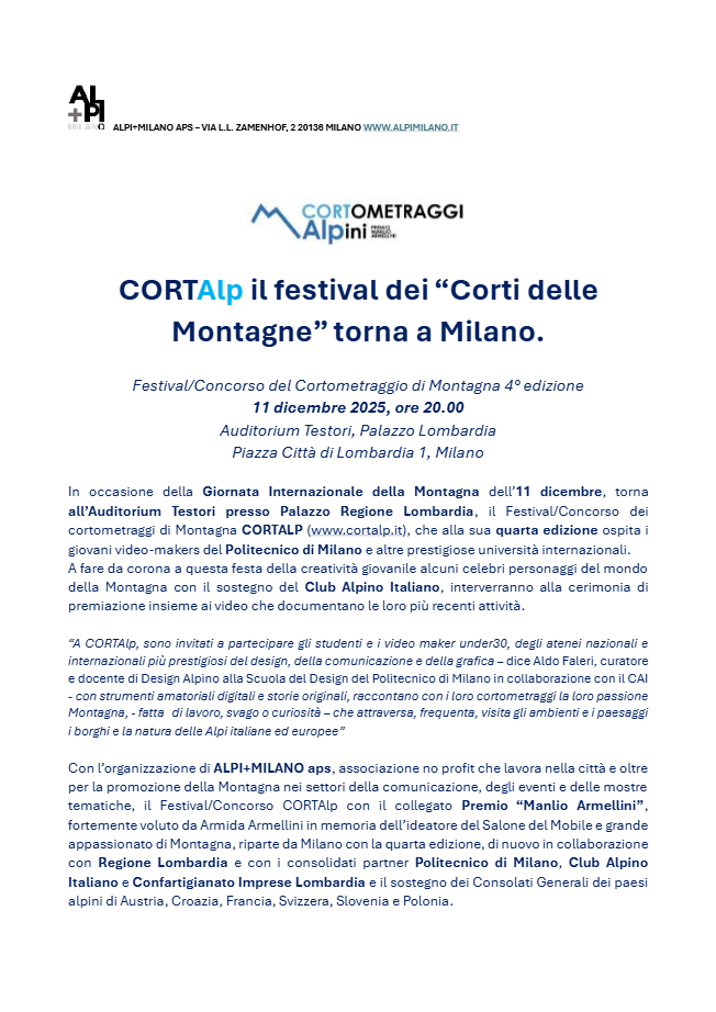 Celebriamo insieme la Giornata Internazionale della Montagna dell’11 dicembre all’Auditorium Testori presso Palazzo Regione Lombardia, con il Festival/Concorso dei cortometraggi di Montagna CORTALP, che alla sua quarta edizione ospita i giovani video-makers universitari e amanti delle terre alte.